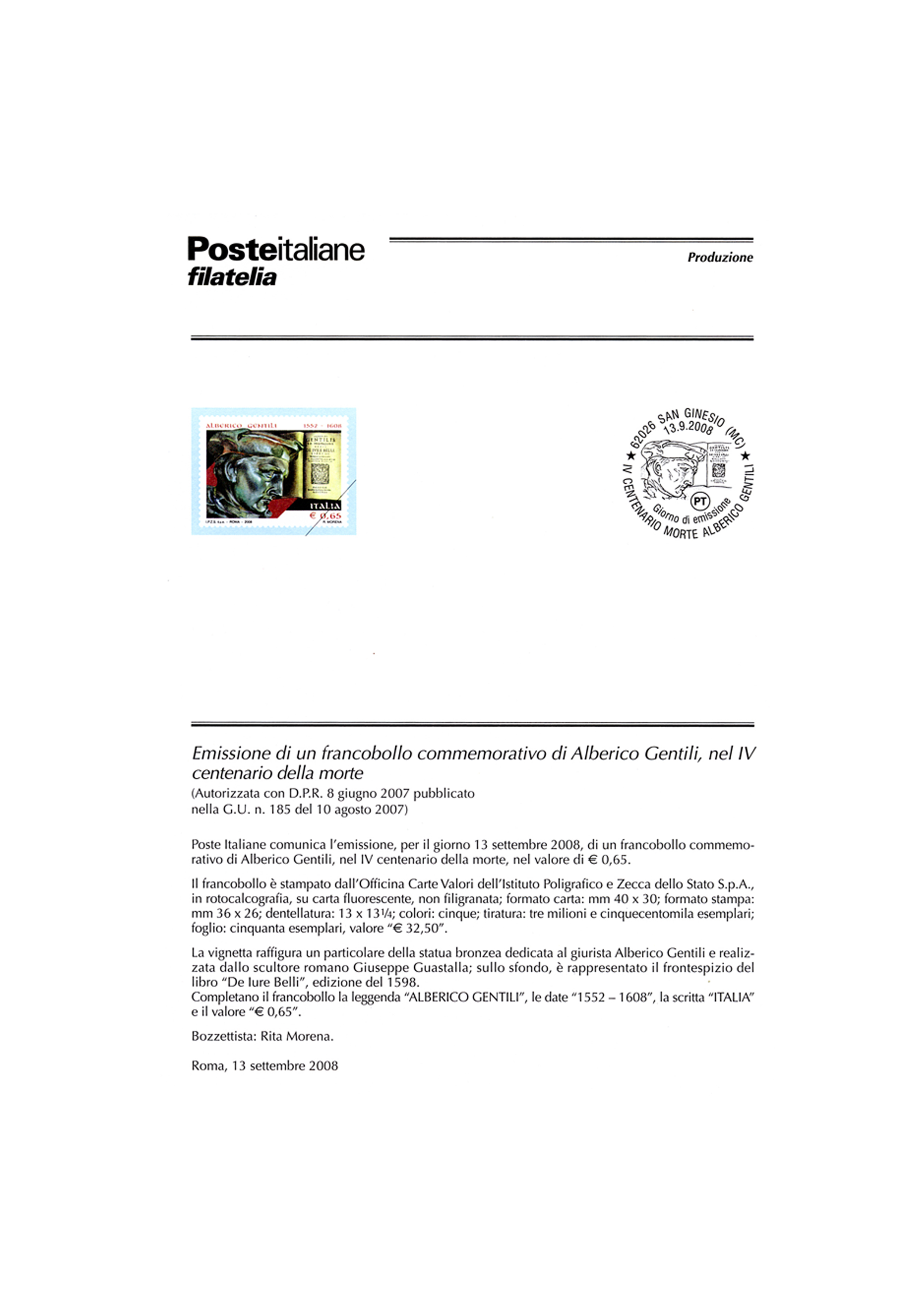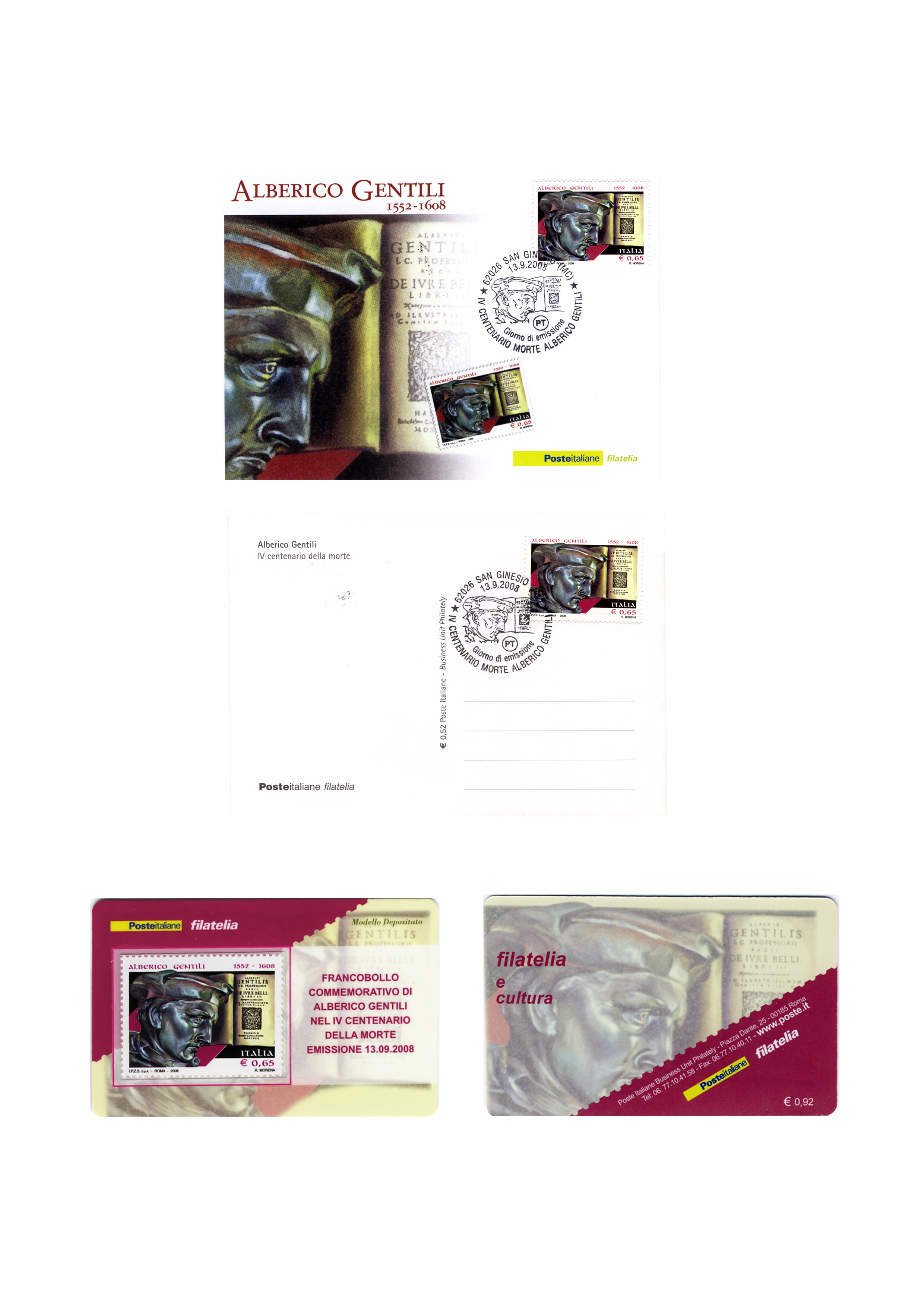 in occasione del IV Centenario della morte di Alberico Gentili, "Alberico Gentili" €0,65, San Ginesio 13 settembre 2008