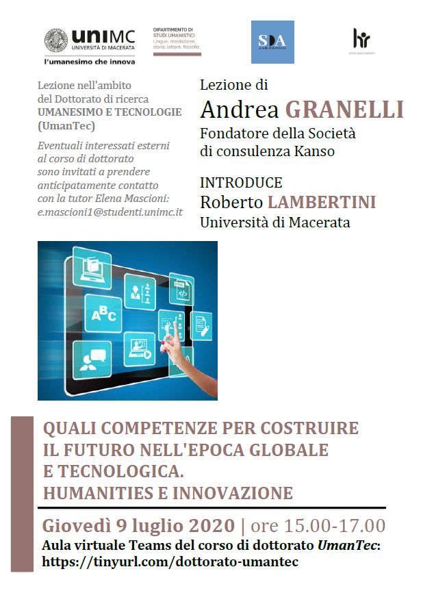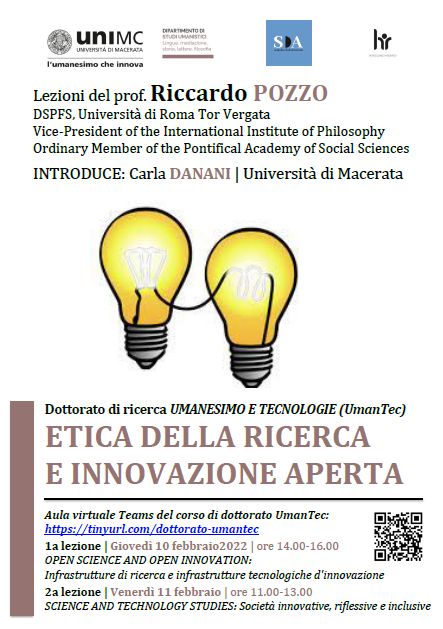 Lezioni del Prof. Riccardo POZZO | Università di Roma Tor VergataINTRODUCE: Carla DANANI | Università di Macerata10 febbraio 2022 / ore 14.00-16.00Infrastrutture di ricerca e infrastrutture tecnologiche d'innovazione 11 febbraio 2022 / ore 11.00-13.00SCIENCE AND TECHNOLOGY STUDIES: società innovative, riflessive e inclusive Aula virtuale Teams del Corso di Dottorato UmanTec: https://tinyurl.com/dottorato-umantec |
