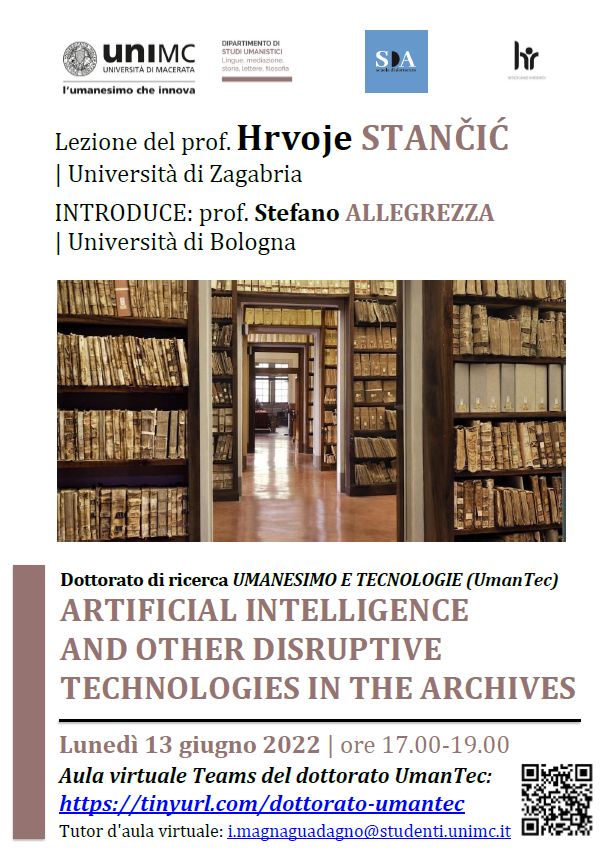13 giugno 2022/ ore 17:00 - 19:00Lezione del prof. Hrvoje STANČIĆ | Università di Zagabria INTRODUCE: prof. StefanoALLEGREZZA | Università di Bologna Aula virtuale Teams del dottorato UmanTec:https://tinyurl.com/dottorato-umantec |