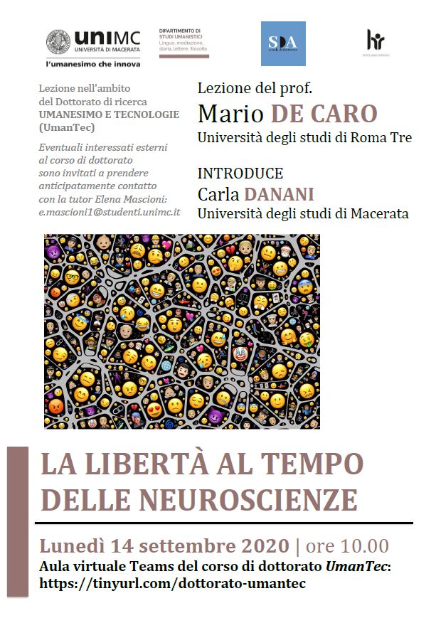 14 settembre 2020| ore 17 Mario De Caro (Univ. Roma Tre) Lezioni a distanza su piattaforma TEAMS: https://tinyurl.com/dottorato-umantec |