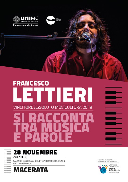 Francesco Lettieri si racconta. TRA MUSICA E PAROLEEvento riservato agli studenti dell'Università di Macerata. UniMC amica del pianetahttps://www.unimc.it/it/unimc-comunica/events/2019/francesco-lettieri-si-racconta-tra-musica-e-parolehttps://www.unimc.it/it/unimc-comunica/events/2019/francesco-lettieri-si-racconta-tra-musica-e-parole/@@download/image/Bannerone_LETTIERI.jpg