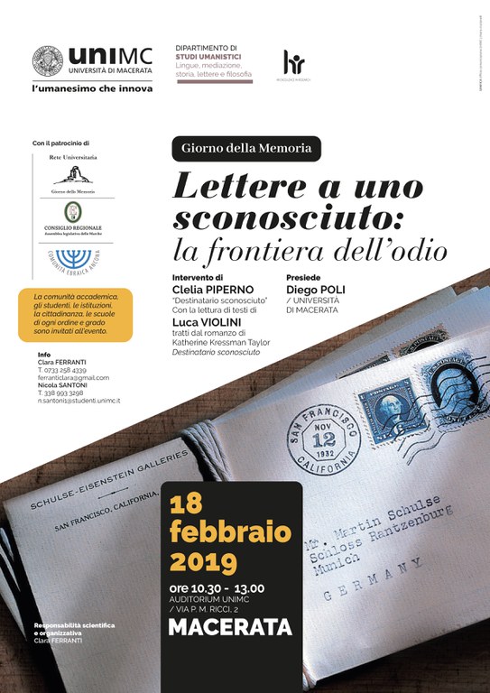 GIORNO DELLA MEMORIA | Lettere a uno sconosciutoLa frontiera dell’odiohttps://www.unimc.it/it/unimc-comunica/events/2019/giorno-della-memoria-lettere-a-uno-sconosciutohttps://www.unimc.it/it/unimc-comunica/events/2019/giorno-della-memoria-lettere-a-uno-sconosciuto/@@download/image/giornata memoria.jpg