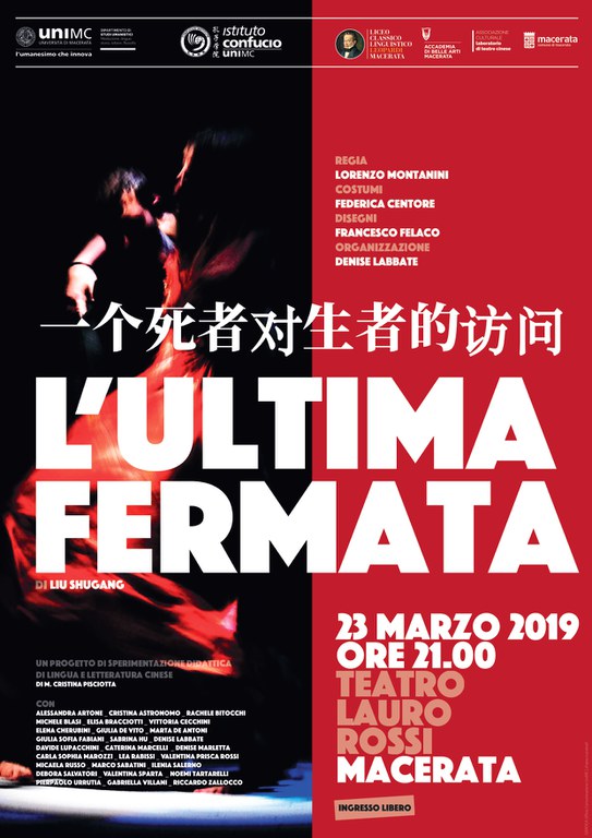 Regia Lorenzo Montanini Costumi Federica Centore Disegni Francesco Felaco Organizzazione Denise Labbate Un progetto di sperimentazione didattica di Lingua e Letteratura Cinese di M. Cristina Pisciotta con Alessandra Artone _ Cristina Astronomo _ Rachele Bitocchi _ Michele Blasi _ Elisa Bracciotti _ Vittoria Cecchini _ Elena Cherubini _ Giulia De Vito _ Marta De Antoni _ Giulia Sofia Fabiani _ Sabrina Hu _ Denise Labbate _ Davide Lupacchini _ Caterina Marcelli _ Denise Marletta _ Carla Sophia Marozzi _ Lea Rabissi _ Valentina Prisca Rossi _ Micaela Russo _ Marco Sabatini _ Ilenia Salerno _ Debora Salvatori _ Valentina Sparta _ Noemi Tartarelli _ Pierpaolo Urrutia _ Gabriella Villani _ Riccardo Zallocco