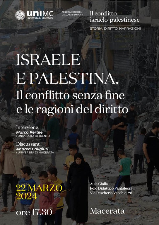 ISRAELE E PALESTINA. Il conflitto senza fine e le ragioni del dirittoNell'ambito del ciclo "Il conflitto israelo-palestinese STORIA, DIRITTO, NARRAZIONI"https://www.unimc.it/it/unimc-comunica/events/2024/israele-e-palestina-il-conflitto-senza-fine-e-le-ragioni-del-dirittohttps://www.unimc.it/@@site-logo/logo_unimc_dal1290.png