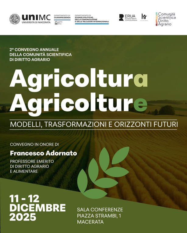 2025-12-12CONVEGNO IN ONORE DI Francesco Adornato PROFESSORE EMERITO DI DIRITTO AGRARIO E ALIMENTAREhttps://www.unimc.it/it/unimc-comunica/events/2025/agricoltura-agricolture-modelli-trasformazioni-e-orizzonti-futuri/2025-12-12https://www.unimc.it/@@site-logo/logo_unimc_dal1290.png
