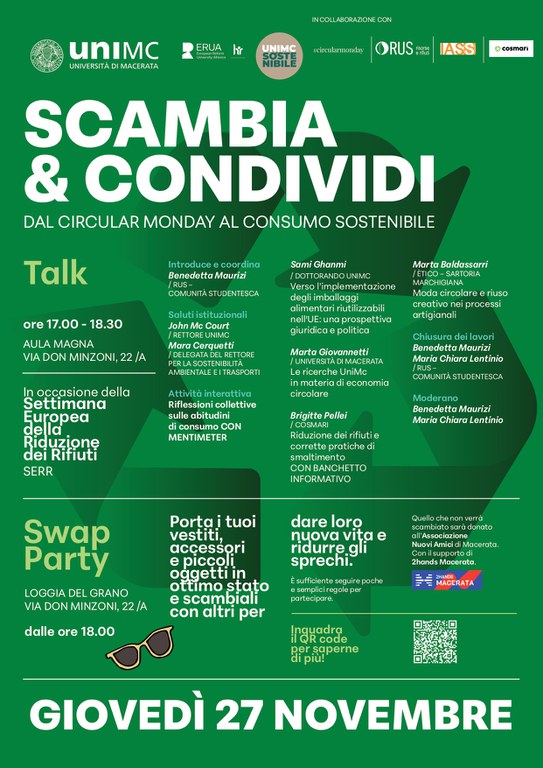 SCAMBIA & CONDIVIDI. Dal Circular Monday al consumo sostenibileIn occasione della Settimana Europea della Riduzione dei Rifiuti SERRhttps://www.unimc.it/it/unimc-comunica/events/2025/scambia-condividi-dal-circular-monday-al-consumo-sostenibilehttps://www.unimc.it/@@site-logo/logo_unimc_dal1290.png