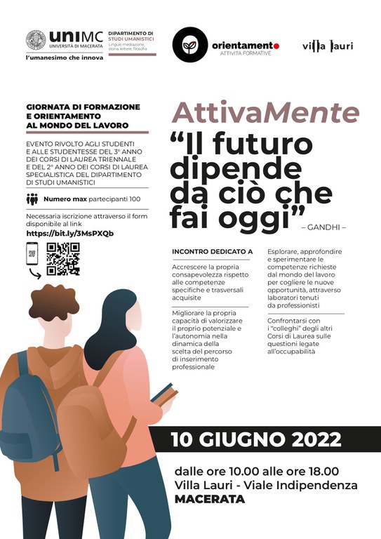 AttivaMente “Il futuro dipende da ciò che fai oggi”GIORNATA DI FORMAZIONE E ORIENTAMENTO AL MONDO DEL LAVOROhttps://www.unimc.it/it/unimc-comunica/events/eventi-2022/attivamente-201cil-futuro-dipende-da-cio-che-fai-oggi201dhttps://www.unimc.it/it/unimc-comunica/events/eventi-2022/attivamente-201cil-futuro-dipende-da-cio-che-fai-oggi201d/@@download/image/Locandina-Giornata-Orientamento-10-giugno-2022_page-0001.jpg