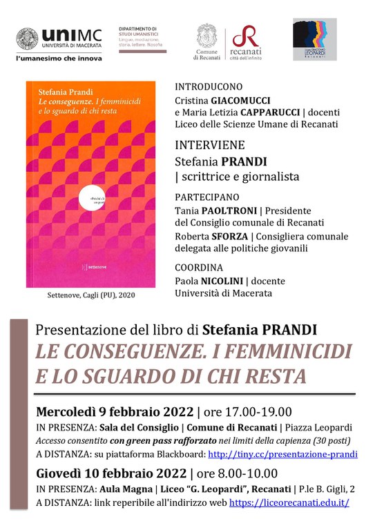Mercoledì 9 febbraio 2022 | ore 17.00-19.00 IN PRESENZA: Sala del Consiglio | Comune di Recanati | Piazza Leopardi Accesso consentito con green pass rafforzato nei limiti della capienza (30 posti) A DISTANZA: su piattaforma Blackboard: http://tiny.cc/presentazione-prandi