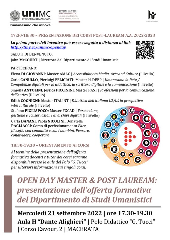 OPEN DAY MASTER & POST LAUREAMPresentazione dell’offerta formativa del Dipartimento di Studi Umanisticihttps://www.unimc.it/it/unimc-comunica/events/eventi-2022/open-day-master-post-laureamhttps://www.unimc.it/it/unimc-comunica/events/eventi-2022/open-day-master-post-lauream/@@download/image/Locandina-OpenDay-Master-21-settembre-2022_page-0001.jpg